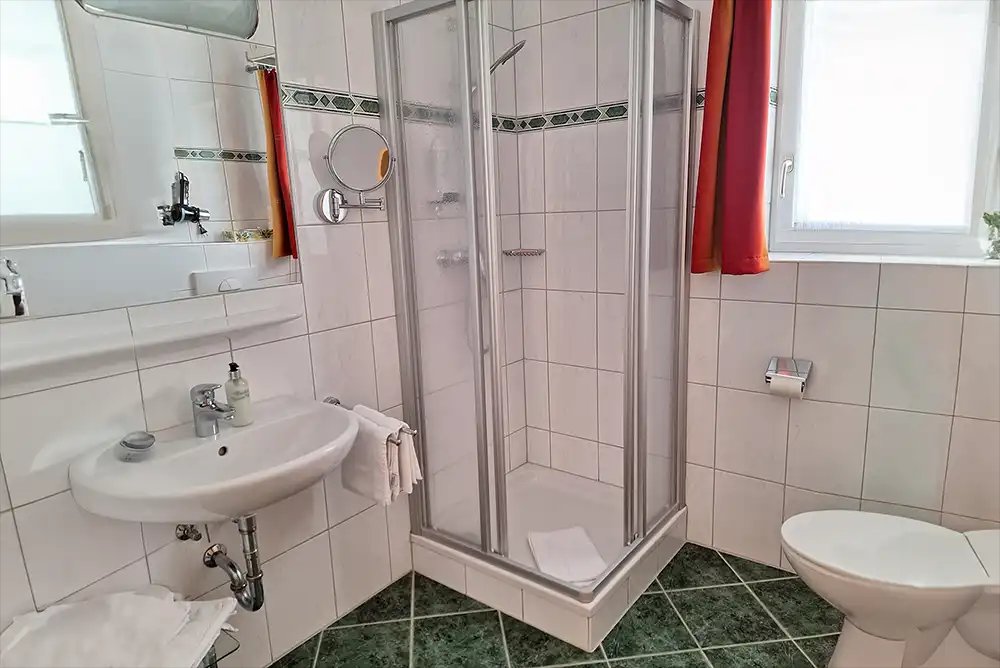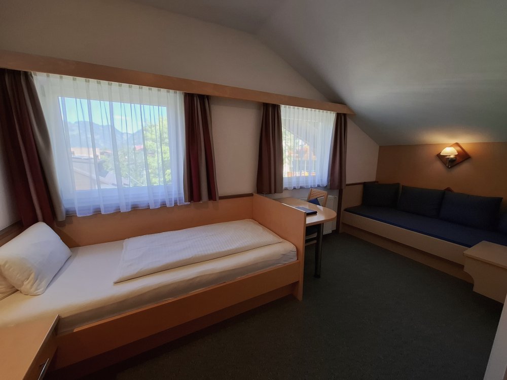 Großzügiges und gemütliches Einzelzimmer im natürlichen Design. Eine bequeme Couch, Schreibtisch mit Stuhl, Telefon, Kabel-TV, Safe, Badezimmer mit Dusche, WC und Haarföhn laden zum Verweilen ein. Auch als Zweibettzimmer buchbar. Das Zimmer hat keinen Balkon.