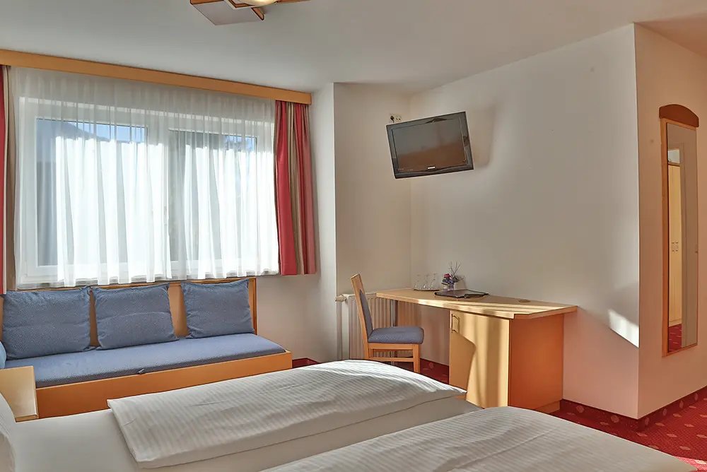 Großzügiges und gemütliches Dreibettzimmer, mit Doppelbett und einem Einzelbett im natürlichen Design. Ein Schreibtisch mit Stuhl, Telefon, Kabel-TV, Safe, Badezimmer mit Dusche, WC und Haarföhn laden zum Verweilen ein. Ein Balkon schafft Raum für das Genießen der wunderschönen Gasteiner Landschaft.